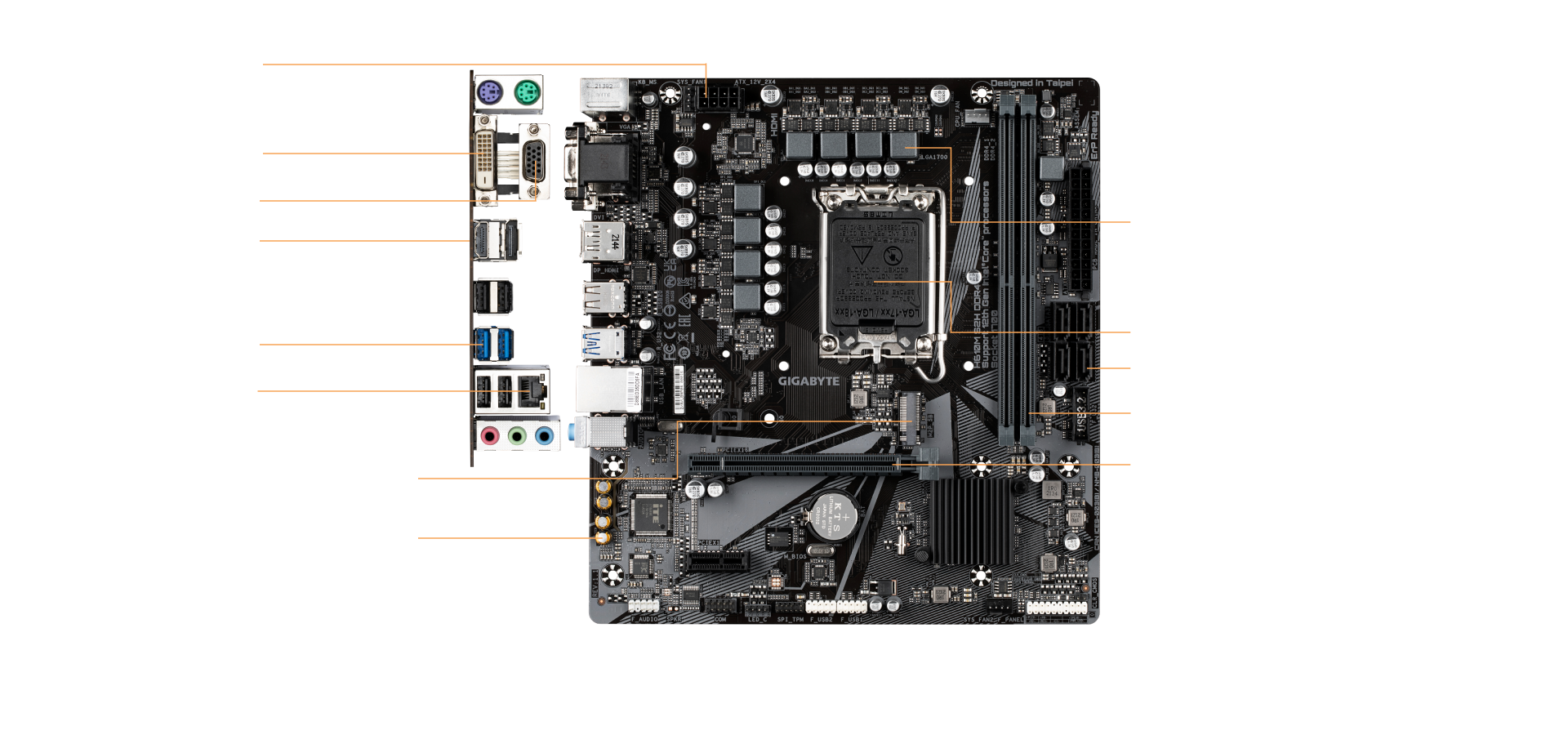 Intel® H610 Motherboard with 6+1+1 Hybrid Phases Digital VRM Design, PCIe 4.0* Design, Gen3 x4 M.2 , Intel® GbE with cFosSpeed , DisplayPort / HDMI / DVI-D/ D-Sub Ports for Multiple Display , Anti-Sulfur Resistor, Smart Fan 6